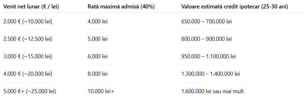 - Valorile sunt orientative și pot varia în funcție de bancă, dobândă, perioadă de rambursare și dacă există alte credite active.
